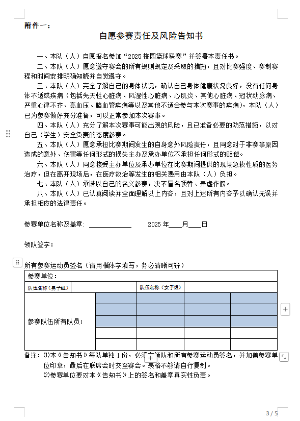(一)以书院为单位,自愿参赛,每单位限报男子五人制队伍1支(队员12名)、女子三人制队伍1支(队员4-6名),每支队伍领队1人、教练1人。(注:领队为书院或院里相关负责老师)
